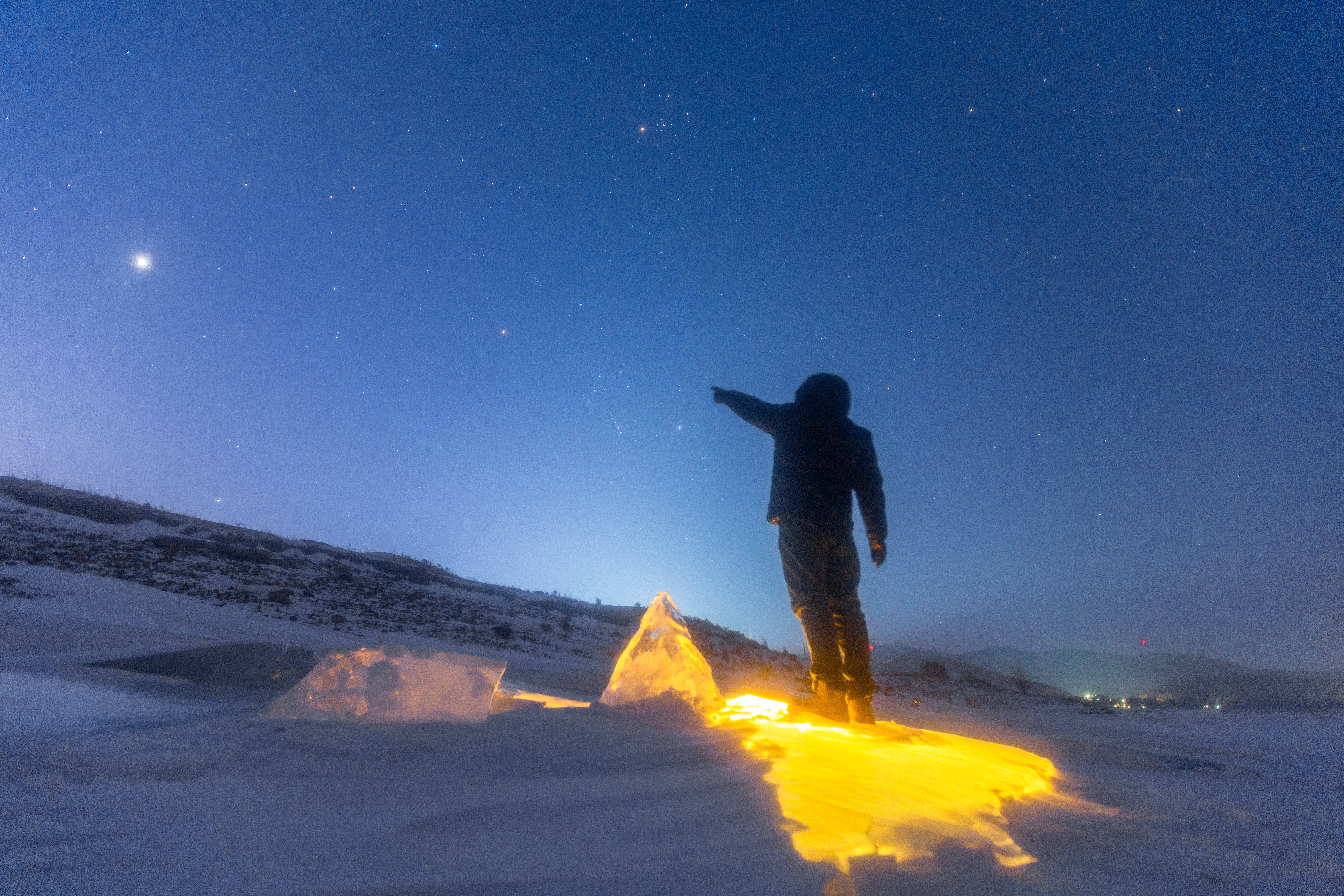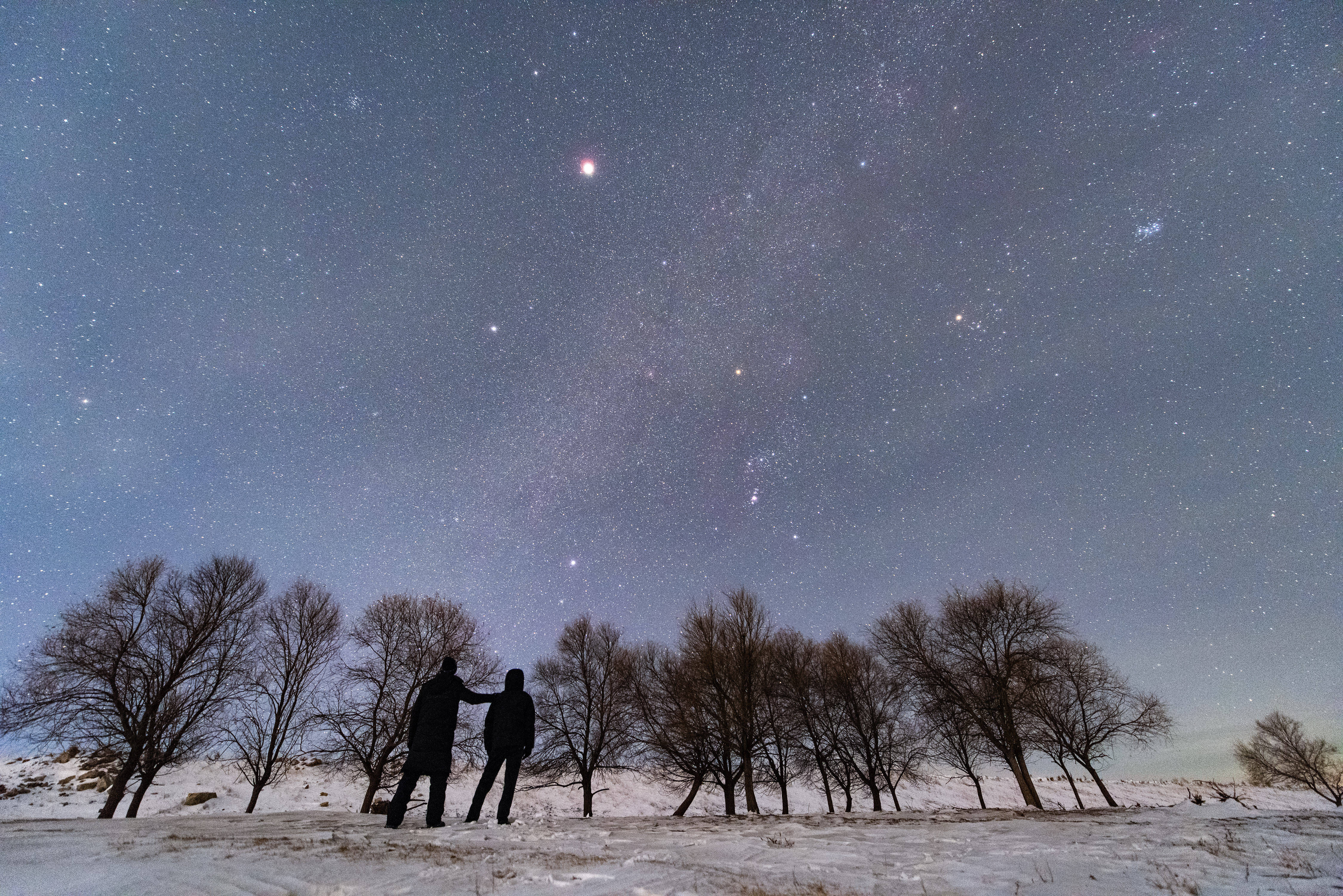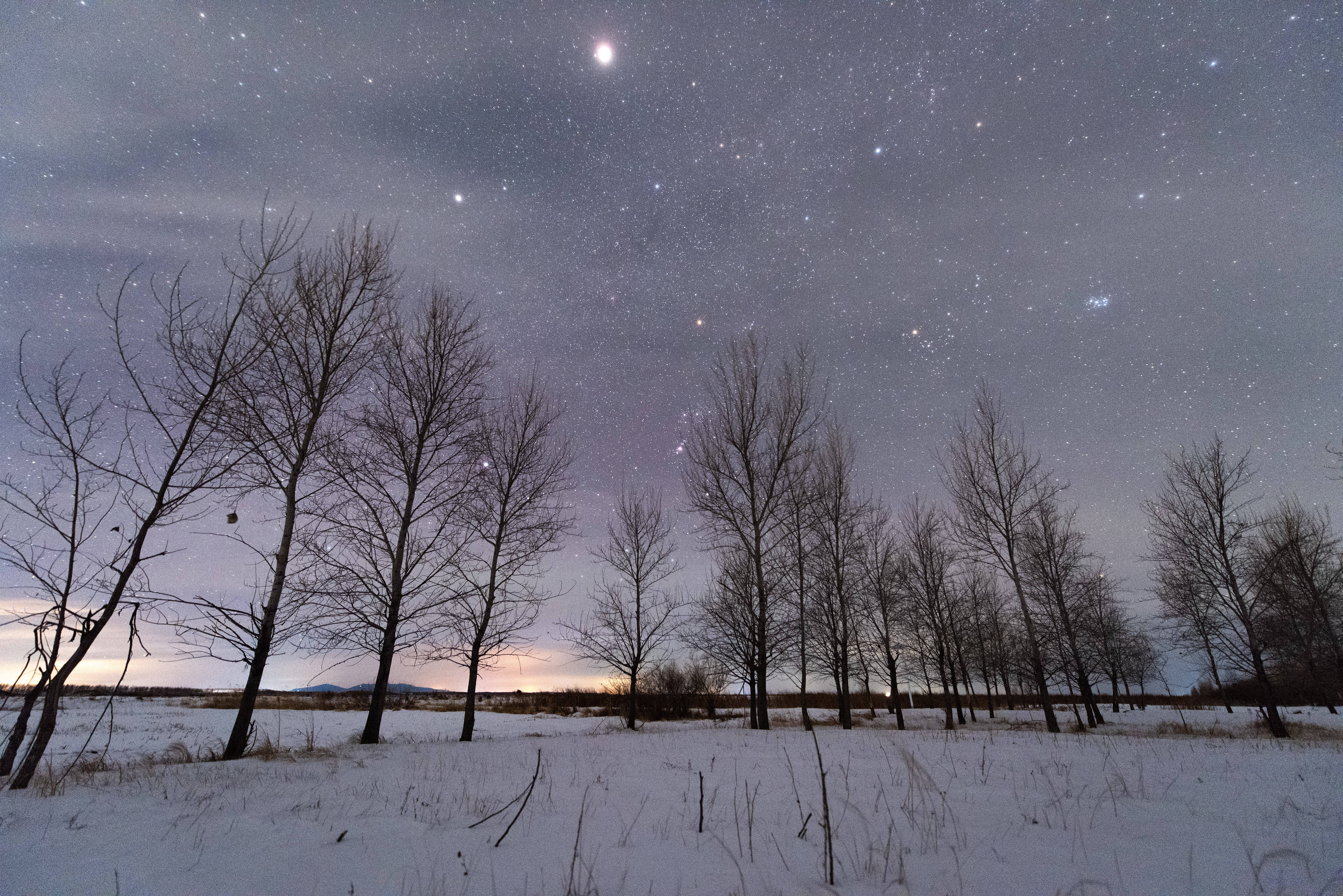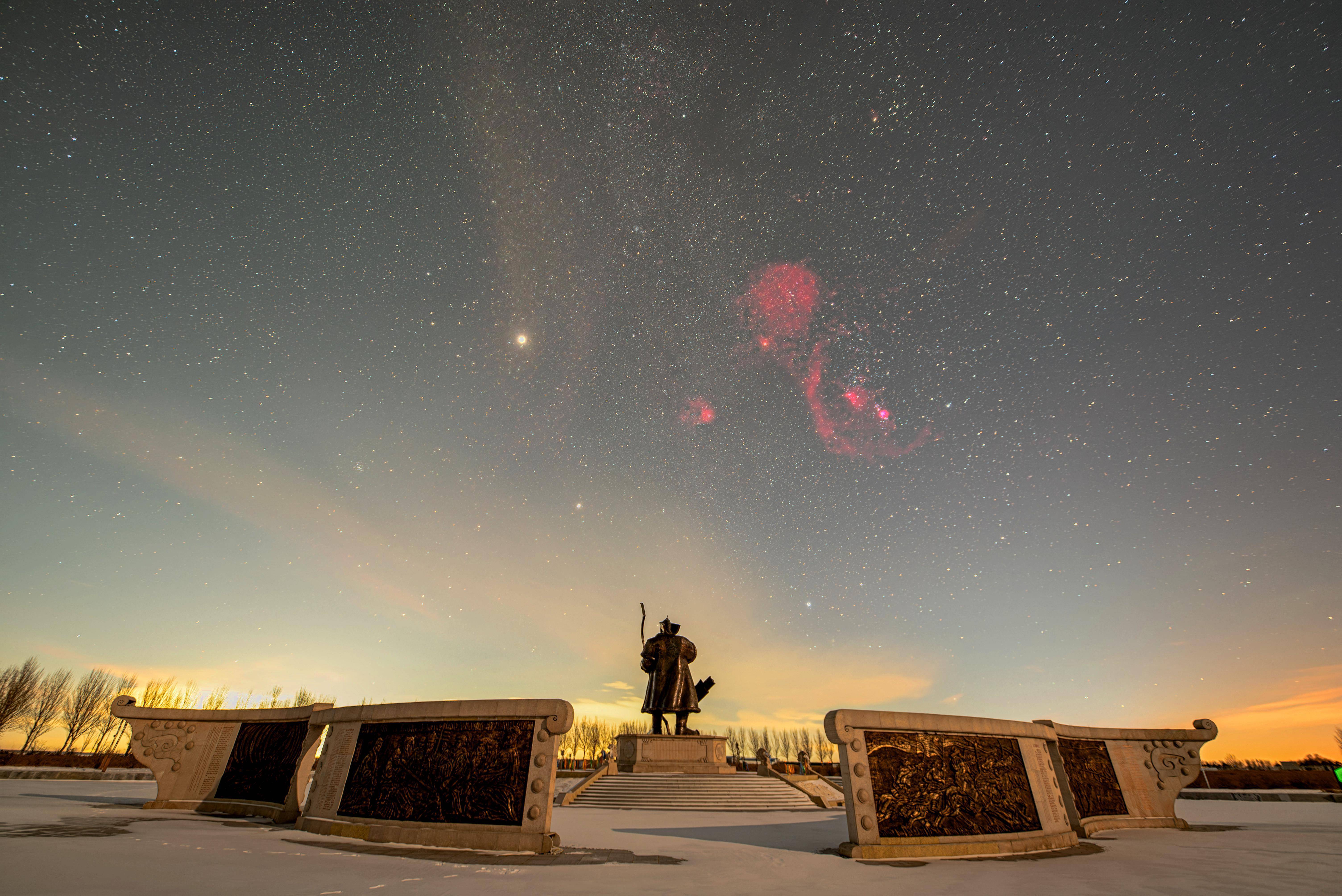 1月18日在黑龙江省佳木斯市敖其湾赫哲族旅游区拍摄的木星与猎户座。新华社发(朱宗强摄)