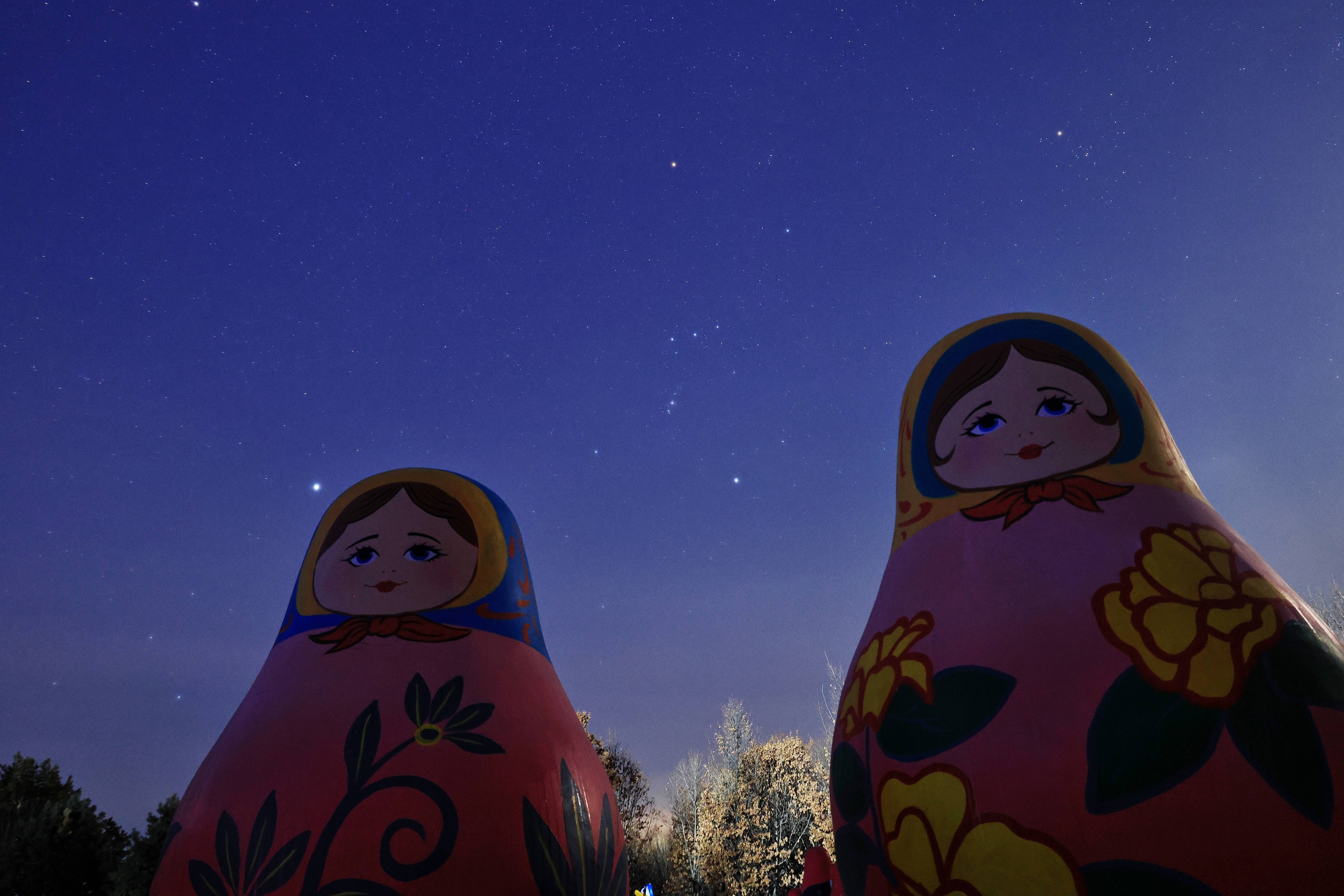 1月18日在黑龙江亚布力滑雪旅游度假区拍摄的星空下的第九届亚冬会祥瑞物(堆栈合成相片)。新华社发(曾东摄)