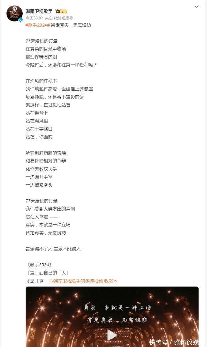 ▲那英在《歌手2024》拿到冠军。 (图/翻摄自微博) 《歌手》制作单元27昼夜深发文,看似是收官感想念,但起首就以「服气委果,无需布防」为标题,写说念:「77天漫长的端详,咱们感谢东说念主群发出的声响,它让东说念主详情——委果,本便是一种态度。服气委果,无需布防。音乐骗不了东说念主,音乐不成骗东说念主。」疑似是在恢复空虚争议。