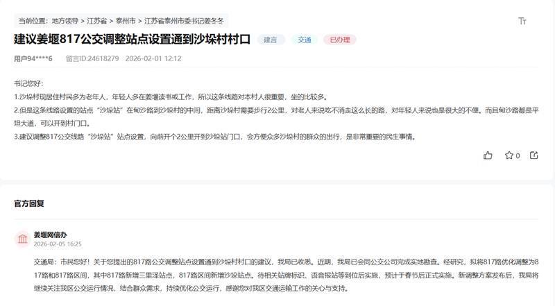 留言4天后,姜堰区交通局会同公交公司完成实地勘查并作念出回复:拟将817路优化调治为干线+区间线,区间线新增沙垛村站点;待站牌、语音报站配套到位,春节后妥当推论。