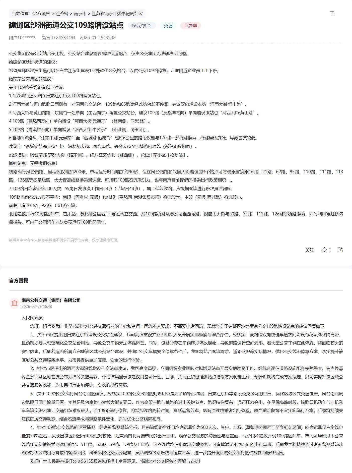 从增设站点、优化清晰到班次调治,过先生写了一份疑望薄情。南京公错乱团飞速复兴:“河西大街沿线增设站点的薄情,经勘查具备可行性,正推动决策制定;白龙江东街站台,待说念路方完成建造、得志靠岸条目后,同步优化靠岸决策;清晰绕行、区间车开设的薄情,将握续监测客流,逢迎出行需求动态调治。”