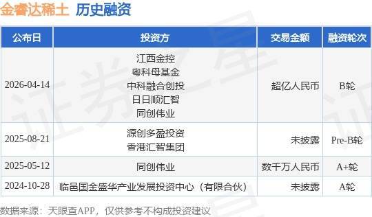 证券之星音问,把柄天眼查APP于4月14日公布的信息整理,山东金睿达稀土新材料有限公司B轮融资欧洲杯体育,融资额超亿东谈主民币,参与投资的机构包括江西金控,粤科母基金,中科会通创投,日日顺汇智,同创大业。